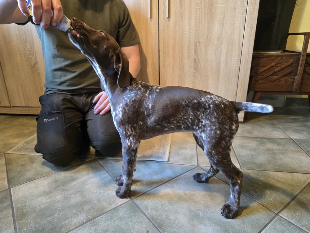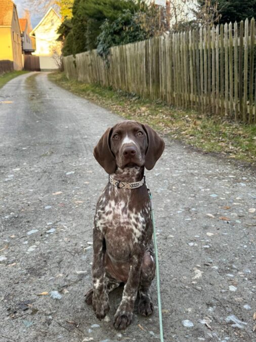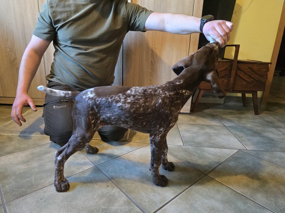 Sie wurde vom Chef des Deutsch Kurzhaarverband Sachsen persönlich abgenommen. Es sind keinerlei Auffälligkeiten vorgekommen. Sie ist absolut fit und Geräusch unempfindlich.