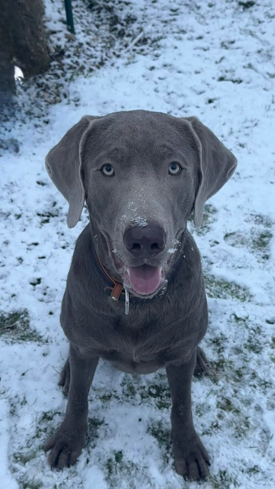 Bones ist ein 10 Monate ( 16.03.2025) alter Labrador/Weimaraner-Mix. Im Haus ist er lieb, verschmust und wachsam. Draußen ist alles interessant und an der Leinenführigkeit muss gearbeitet werden.